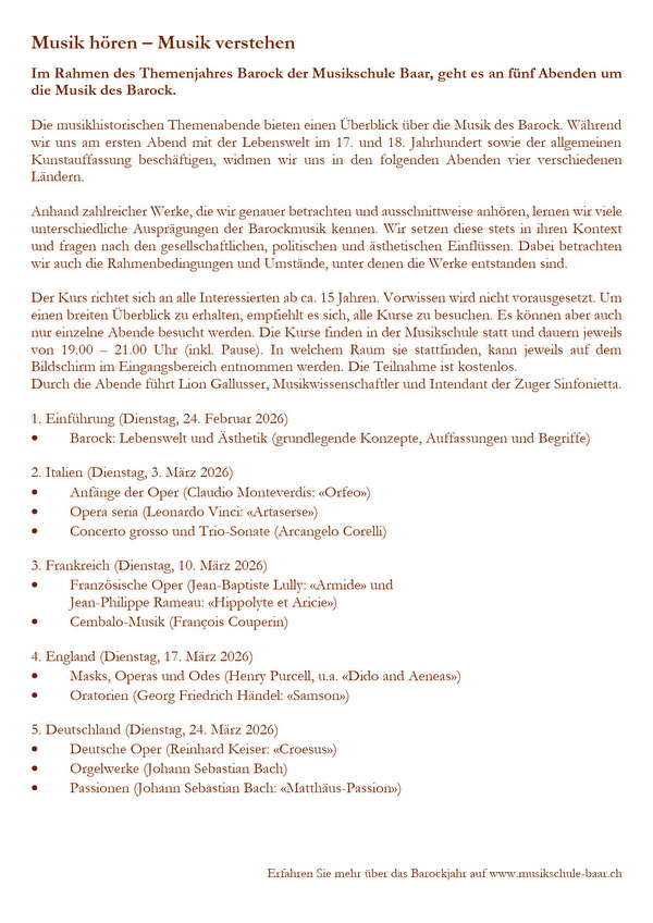 Im Rahmen des Themenjahres Barock der Musikschule Baar, geht es an fünf Abenden um die Musik des Barock.